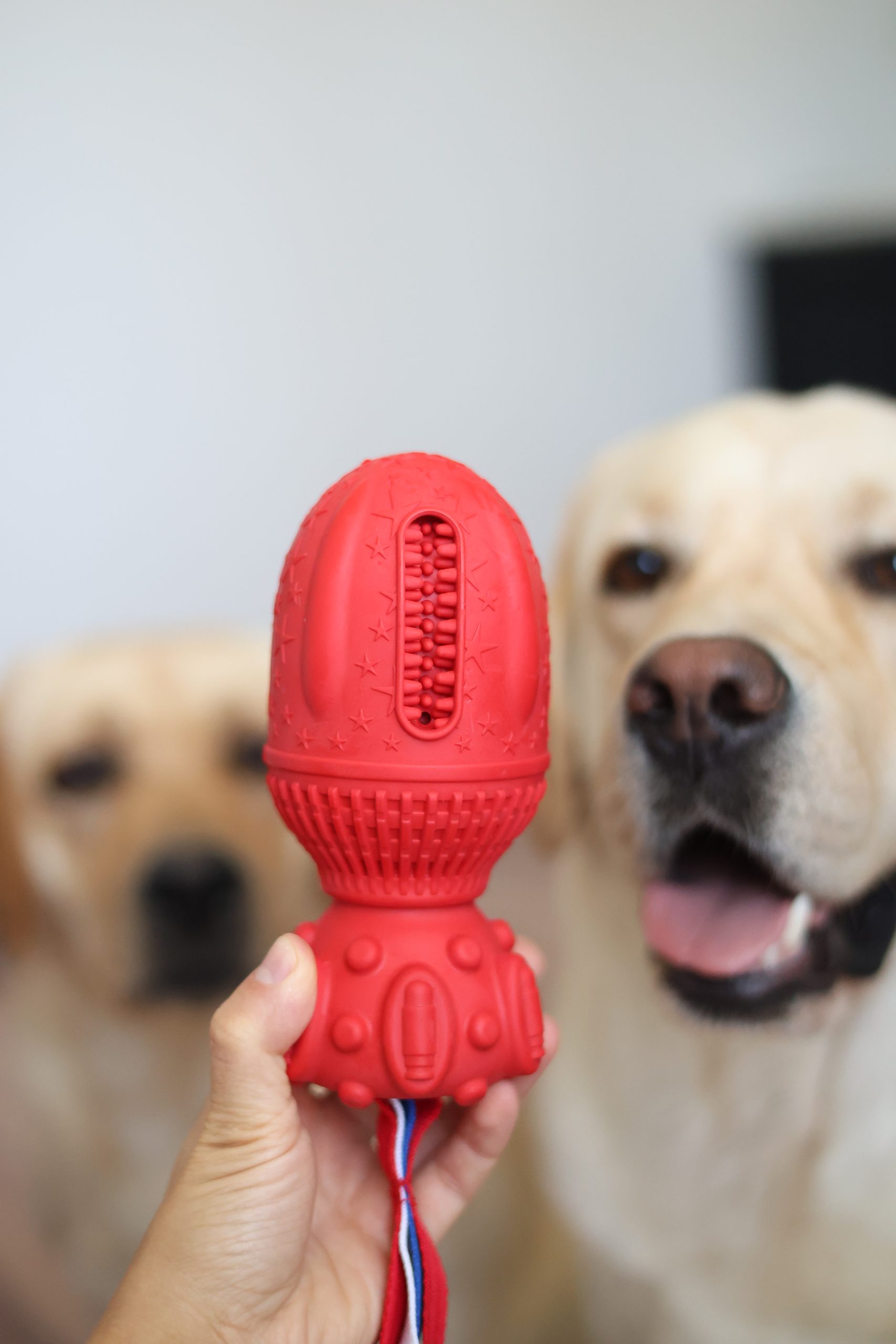 Каучуковая игрушка-рокета 🚀 — идеальна для активных игр и заботы о здоровье питомца! Прочная, упругая и безопасная, она очищает зубы и массажирует дёсны во время игры. 🐶